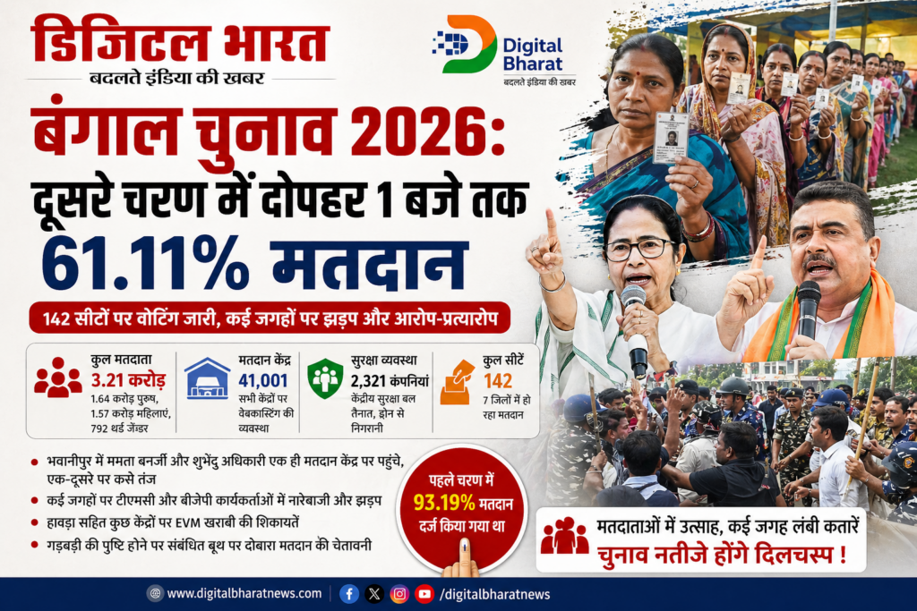 DB l बंगाल विधानसभा चुनाव 2026 के दूसरे और अंतिम चरण में बुधवार को 142 सीटों पर मतदान जारी रहा। चुनाव आयोग के मुताबिक दोपहर 1 बजे तक 61.11% वोटिंग दर्ज की गई, जो पहले चरण के मुकाबले थोड़ा कम है। इस चरण में 7 जिलों के 41,001 मतदान केंद्रों पर वोट डाले जा रहे हैं, जहां कुल 3.21 करोड़ मतदाता अपने मताधिकार का उपयोग कर रहे हैं।